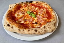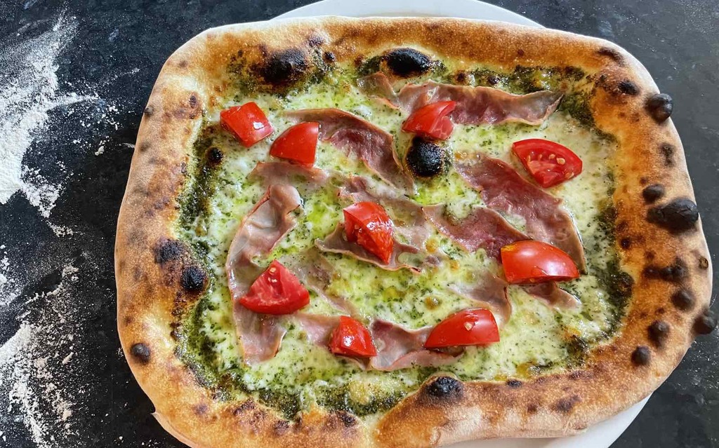 Paradicsom alap, Fior di Latte sajt, pármai sonka, rukkola, parmezán forgács, olivaolaj